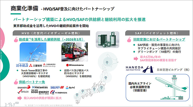 2024年8月、東京都の「バイオ燃料活用における事業化促進支援事業」に選定、日本橋・大手町・丸の内エリアの再開発工事現場の大型重機や人気観光バスでも「サステオ」が使用され、継続的な導入が拡大している。