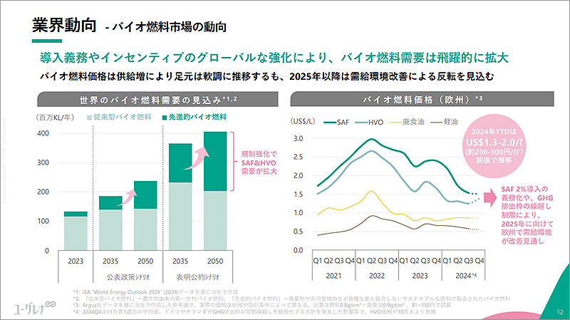 日本の HVO 需要は急速に伸長し、ユーグレナは、ニートHVO(バイオマス原料から生成された純度100% HVO)を、EcoCeres をはじめとするサプライヤーから輸入し、これを日本の軽油規格や顧客要求に合わせた品質調製を行ったうえで、次世代バイオディーゼル燃料「サステオ」として、日本市場に供給している。