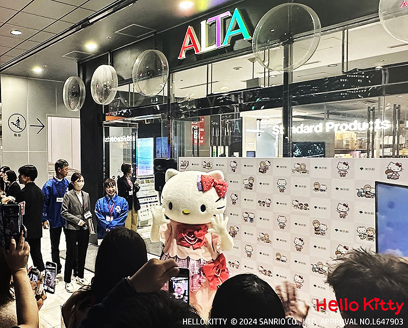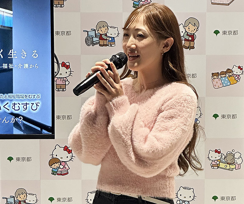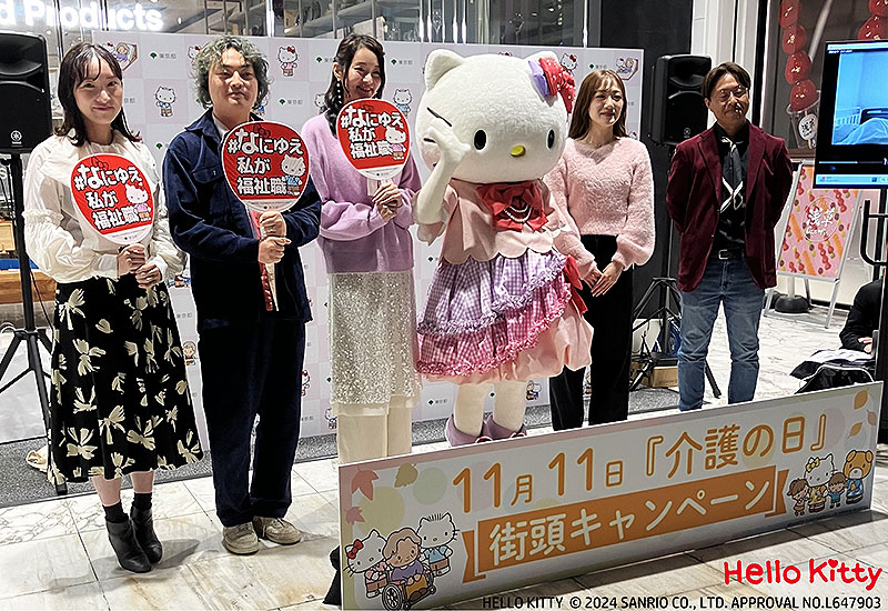現役福祉職の人たちとともに新宿アルタ前で東京都福祉人材情報バンクシステム「ふくむすび」のチラシ配布を行ったほか、ハローキティ撮影会やトークショーを展開。
