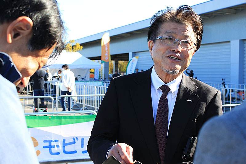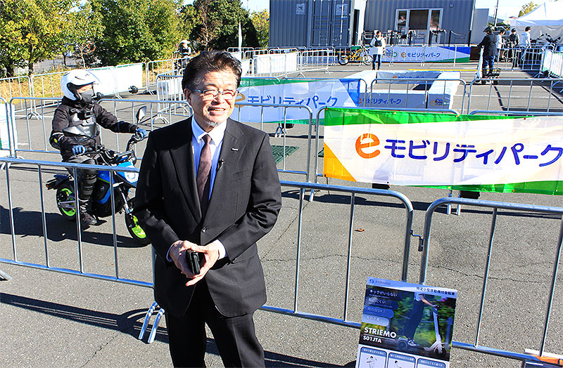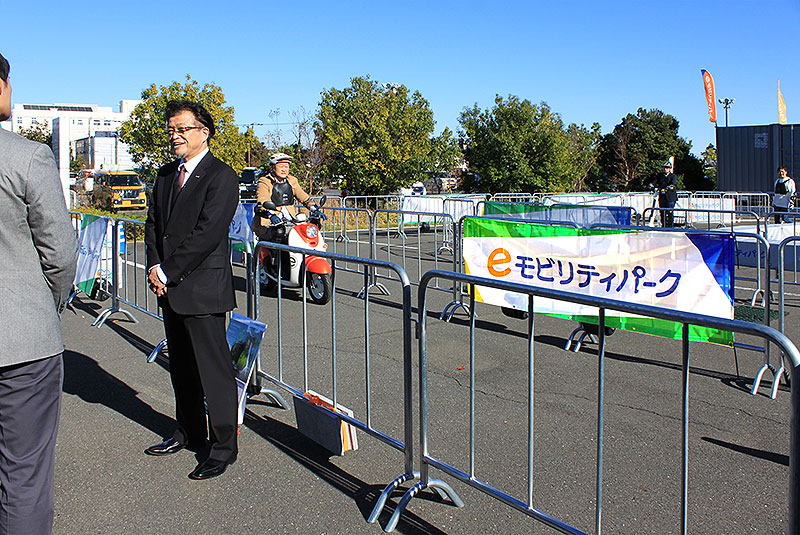 画像↑↑↑は、やさしい笑顔とドヤ顔でこの「eモビリティパーク東京多摩」に込める想いを力説する、松崎一成代表。
