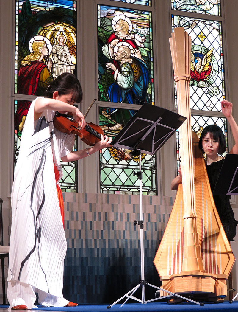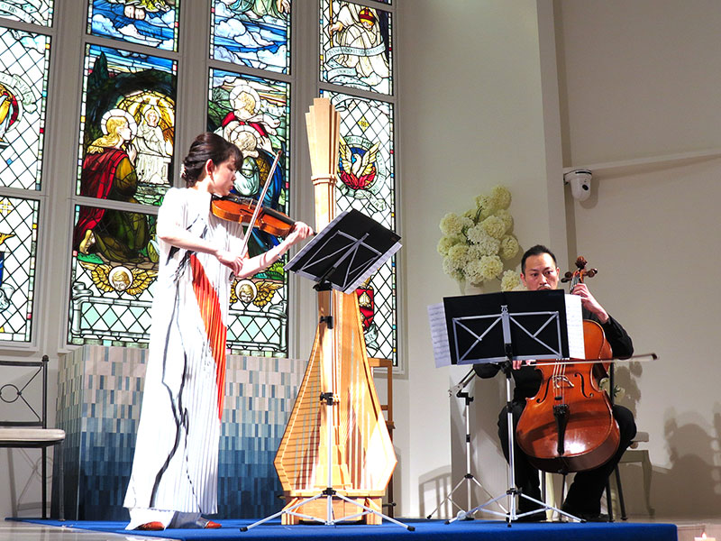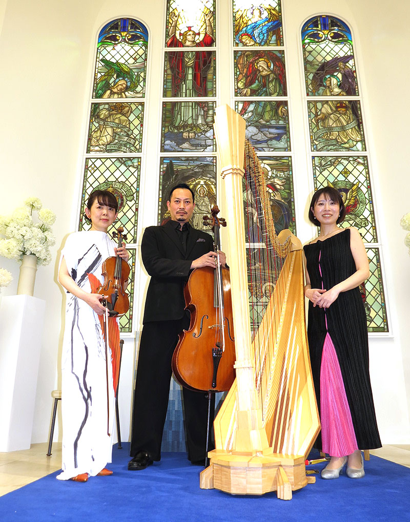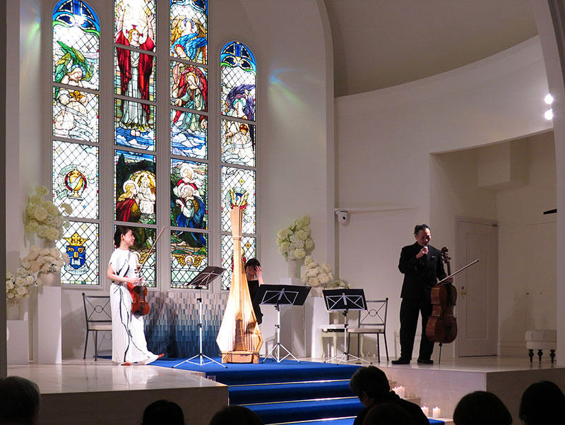 今回、このスペシャルなチャリティーチャペルコンサートで珠玉の弦楽を奏でてくれたのは、ヴァイオリン 田村安紗美、チェロ 弘田徹、ハープ 高野麗音。