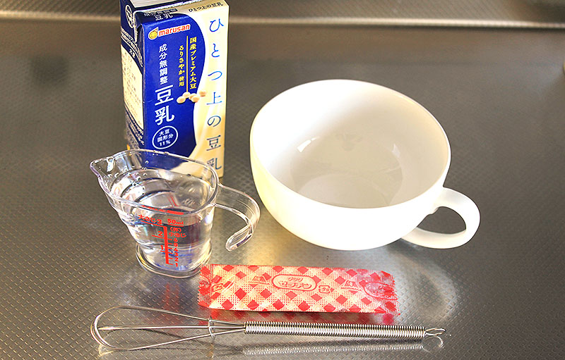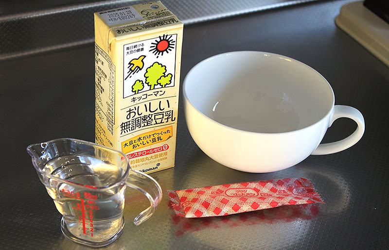 この 豆乳コラーゲンドーム が、お椀に粉末ゼラチンとお湯を入れてよく溶かしたあと、成分無調整 豆乳を加えて全体をよく混ぜて、冷蔵庫で1~2時間よく冷やすだけ。