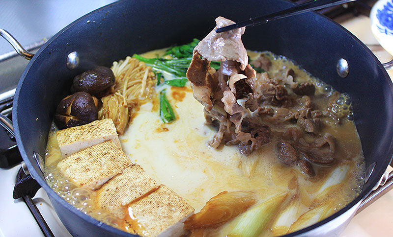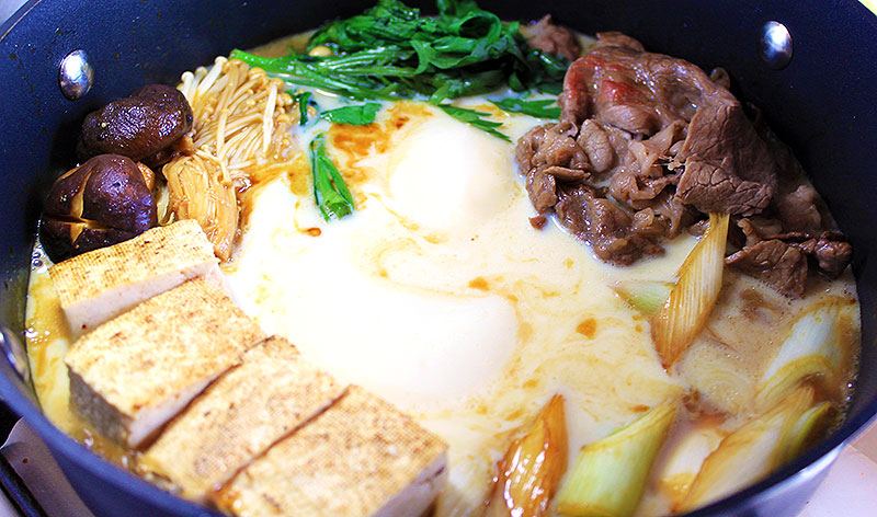 熱でドームがジュワッと溶けて、まろやかな豆乳すき焼きに変身。