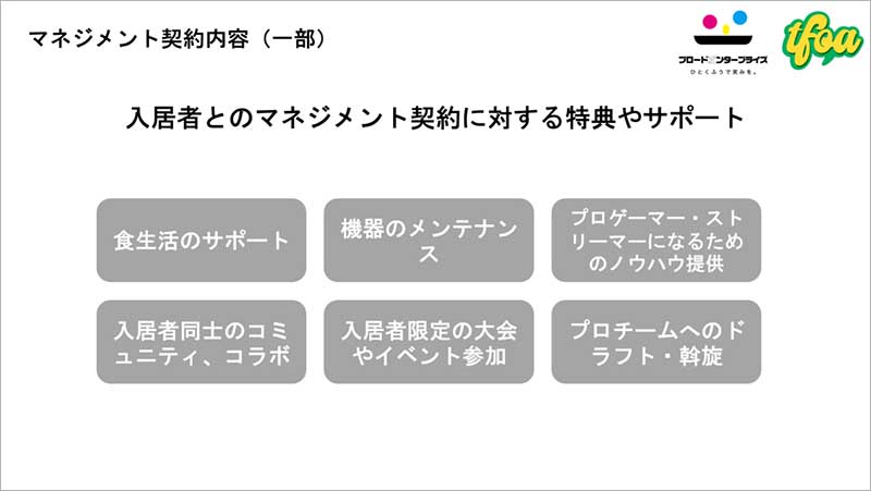 「わたしたちは、機器のメンテナンスに加えて、本気で稼ぎたいという方に対して、食生活のサポートやプロゲーマー・ストリーマーになるためのノウハウ提供、入居者同士のコミュニティ、コラボ、入居者限定の大会の実施・参加、またプロチームへのドラフト・斡旋など、様々なサポートプログラムを提供します。