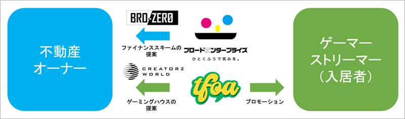 TFOA は、金融機関の審査なしに独自のファイナンススキームで、さまざまな設備や投資にかかる初期費用を 0円にする「BRO-ZERO」を提供するブロードエンタープライズとタッグを組み、不動産オーナーの負担を軽減することでリノベーション件数を増やし、「CREATORZ WORLDゲーミングハウス」の販売拡大も手がける。