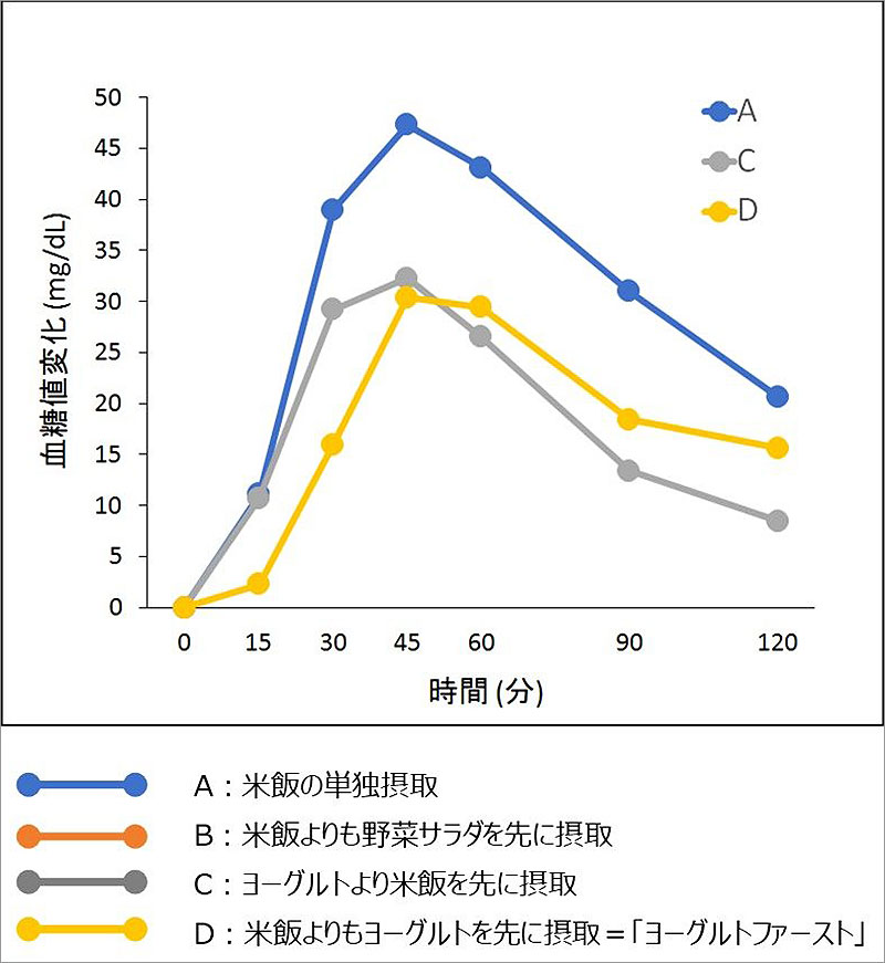 またヨーグルトを米飯の前に食べるヨーグルトファーストは、すでに報告されている、米飯よりも野菜サラダを先に食べる食事法「ベジタブルファースト」と同等、またはそれ以上の効果があることがわかった。