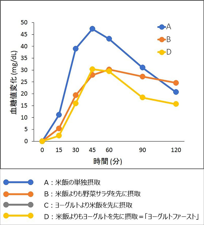 当時の調査結果によると、ヨーグルトを米飯の前に食べると、食後の血糖値の上昇抑制をすることが判明。