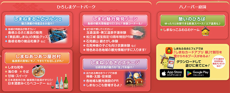 県産品直売、絶品和菓子、日本酒のみ比べ、温泉体験、宿泊券やしまね和牛が当たるアンケートも!