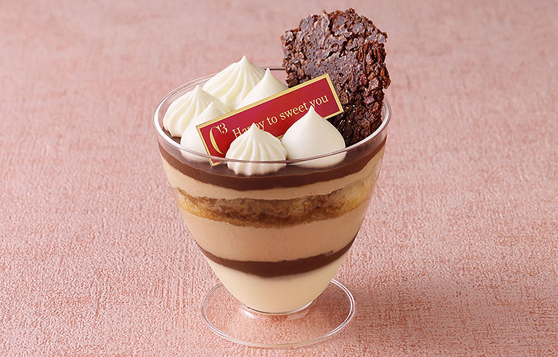 チョコレートのティラミスクリームにエスプレッソ香るソースがしみ込んだビスキュイの層に濃厚なミルクプリンがイン。