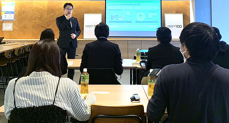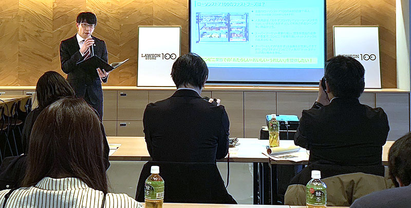 ローソンストア100 吉田貫臣 上級執行役員 商品グループ統括、ローソンストア100中食・冷食ユニット 安在裕樹 マーチャンダイザーもドヤ顔で猛プッシュ! 激アツプレゼンに聞き入る記者たちも納得&胸アツ! ぱくっ。うんまーっ!