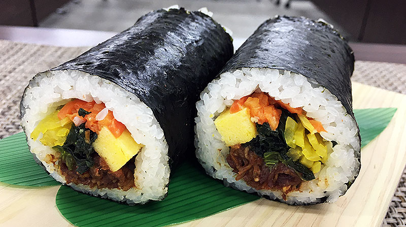 牛カルビ、ほうれん草、たくわん、にんじん、玉子焼きが入ったスタミナ満点の韓国ふう海苔巻き。