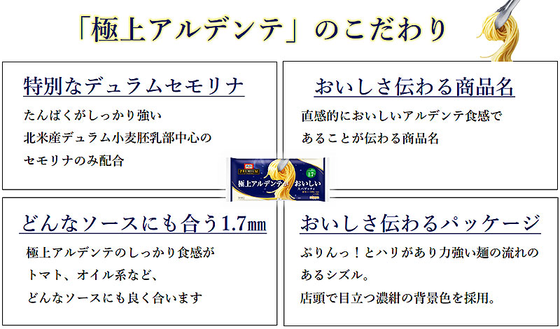 「オーマイプレミアム 極上アルデンテがおいしいスパゲッティ 1.7 mm」(ゆで時間8分)の特長はここ↓↓↓