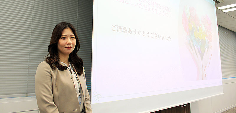 東島愛美 看護師は、がん治療中に起こりやすい皮膚症状や日常で取り入れたいスキンケアについて講義。