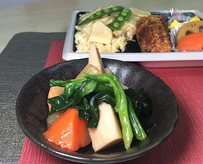 昆布とかつお、鳥の旨みのお出汁と春を感じるたけのことスナップエンドウを組み合わせた、「たけのこご飯」が主役のお弁当。