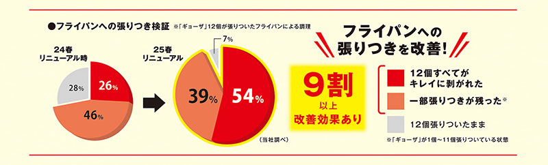 「12個完全に張りついてしまう古フライパンで調理検証したところ、その内の9割以上のフライパンで<ギョーザ>の張りつき改善効果が確認できました。より張りつきにくくなり、誰でもパリッとした羽根つき餃子が焼けるようになりました」