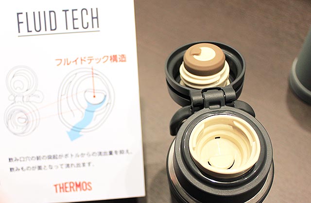 このフルイドテック構造は、飲み口からドバっと大量のドリンクが出ないように工夫されたサーモス独自の仕組み。