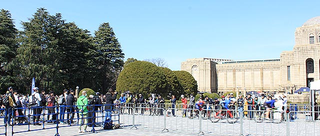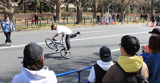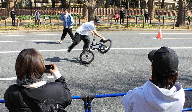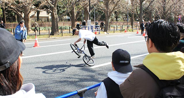 サイクルチャレンジ神宮外苑(2/16 @東京)の神宮外苑いちょう並木に登場したのは、千葉県松戸市が生んだ世界最強のBMXフラットランドライダー、荘司ゆう。
