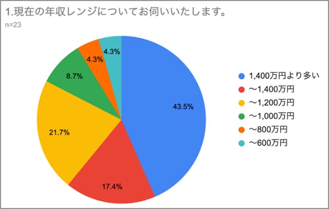 また、最も多い年収レンジは「1,400万円より多い」の層で、全体の43.5%を占めた。