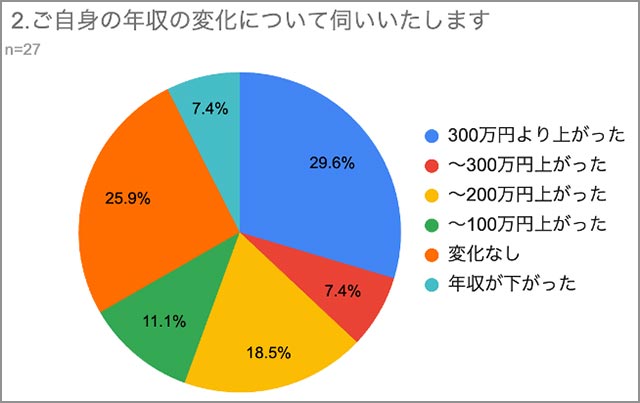 約66.6%が年収アップを実現し、とくに300万円以上の昇給が最多(29.63%)だった。