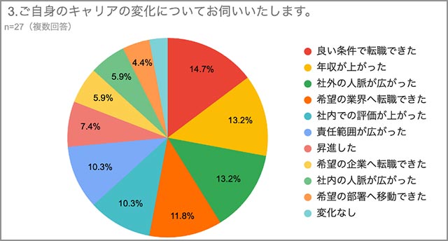 転職市場での競争力向上や社内評価の向上が見られ、スキル向上やネットワーク形成が成功要因と考えられる。