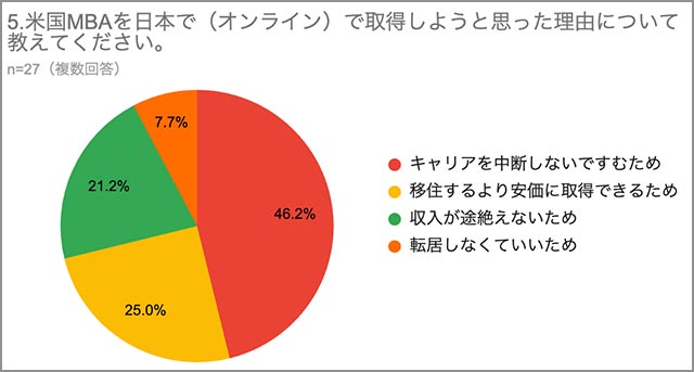 米国MBAを日本でオンライン取得する理由として、「キャリアを中断せずに学べる」(46.2%)が最多。
