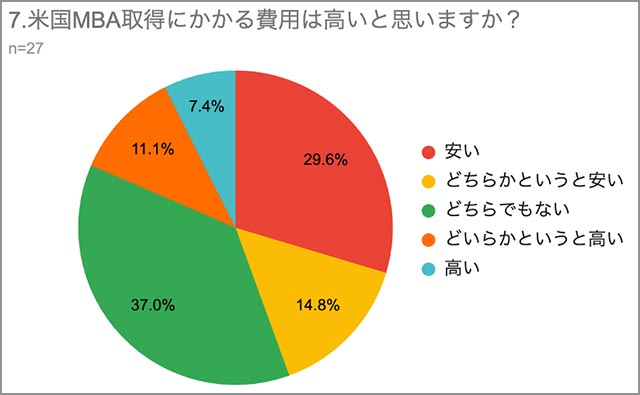 「高い」と感じる人(18.5%)は少数派であり、全体的に UMassMBA の取得費用は適正と認識されている傾向にある。