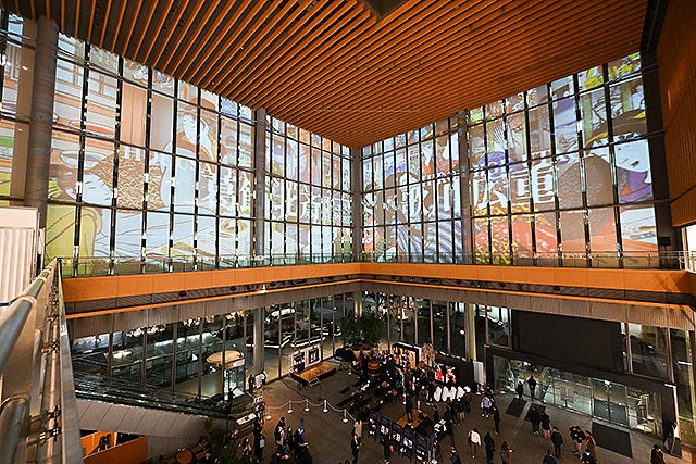 巨大な壁面をキャンバスとして活用し、浮世絵の鮮やかな色彩と美しい構図を際立たせる空間演出。
