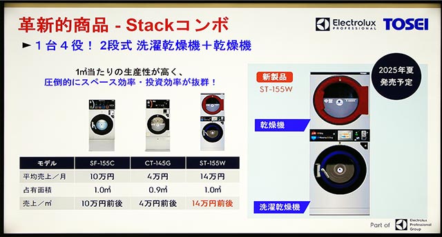 そのなかでも注目を集めた「世界初!スタック型乾燥機+洗濯乾燥機『ST-155W』」(今夏発売予定)は、2段式洗濯乾燥機+乾燥機の Stack コンボで、「1平米あたりの生産性が高く、圧倒的なスペース効率・投資効率が抜群」とうたうモデル。