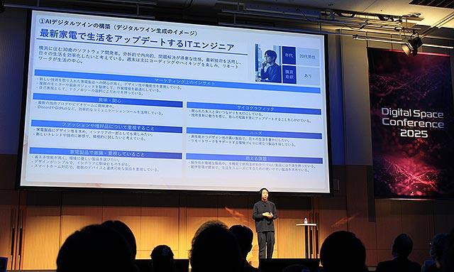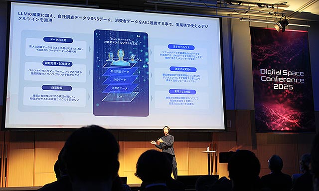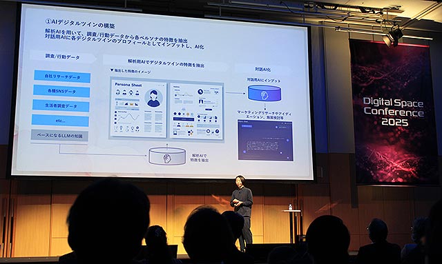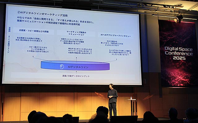 電通デジタル 有益伸一 D は、「電通グループがもつリサーチデータ・各種SNSデータ・生活社調査データなどと AI でデジタルツインを実現させ、マーケティングを最大化・効率化できる」という。