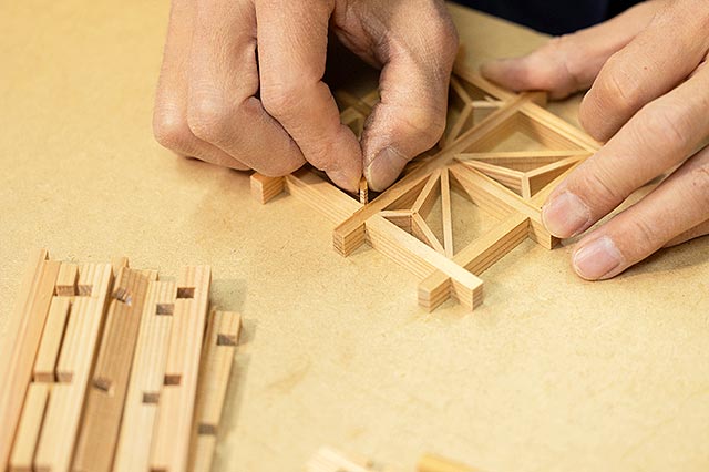 細かく削った木片を組み合わせ、麻の葉模様に組み上げていただきます。出来上がったコースターはお持ち帰りいただけます。
