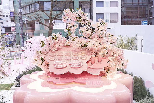 4mの巨大桜モニュメントと「Pink Blossom」コレクションのアイコン アイシャドウパレット「ラブブロッサム」「ブルーミングシャドウ」「ピュアウォーターリップグロス」のオブジェがばーん!