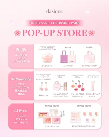 ここポップアップストア「dasique Pink Blossom」(3/6~3/30 @東京 表参道)で商品を買うと、「dasique」のロゴが入ったエコバックや桜の絵柄が入った限定ショッピングバックなどをプレゼント!