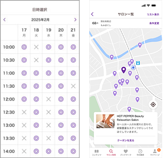 30分ごとの空き状況が確認できるから、自分の予定に合わせた予約ができ、エリア検索機能で通いやすいサロンを見つけることができる。
