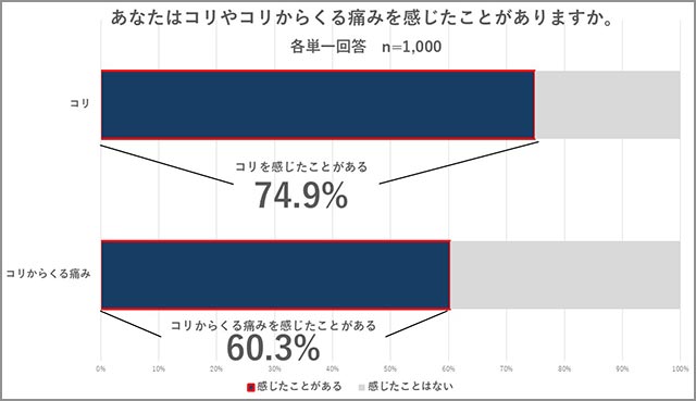 今回の調査では、働く人の74.9%が「身体のコリを感じたことがある」と回答。また、60.3%の人が「コリからくる痛みを感じたことがある」と回答した。