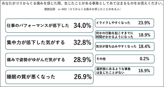さらに、コリからくる痛みによってどのような事象が生じたか質問したところ、最も多かった回答は「仕事のパフォーマンスが低下した」で34.0%。