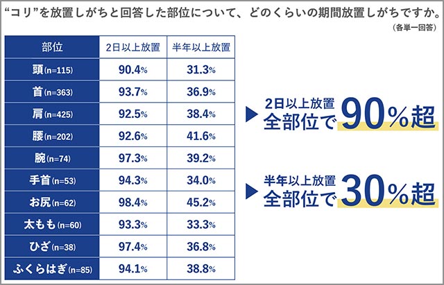 今回の調査で、身体のコリを放置しがちな人にその期間について聞くと、いずれの部位でも「2日以上」が9割超、「半年以上」も3割超。