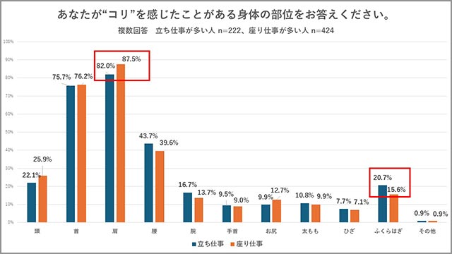 コリに関する傾向として、立ち・座り仕事など働き方による違いも調査。
