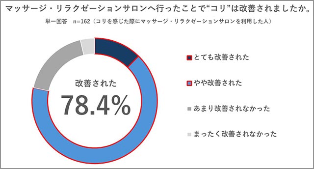 実際、コリを感じた際にマッサージ・リラクゼーションサロンを利用したことがある人にコリが改善されたかどうか聞いたところ、約8割の人が改善を実感していることが判明。