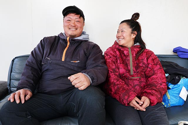 伊藤潤哉さんとその妻 美保さんが待つここ 利府の杜 で、湯通し塩蔵、脱水、葉と茎を分ける芯抜きといった一次加工を経て、カネリョウ海藻の熊本本社工場・仙台工場へと送られる。