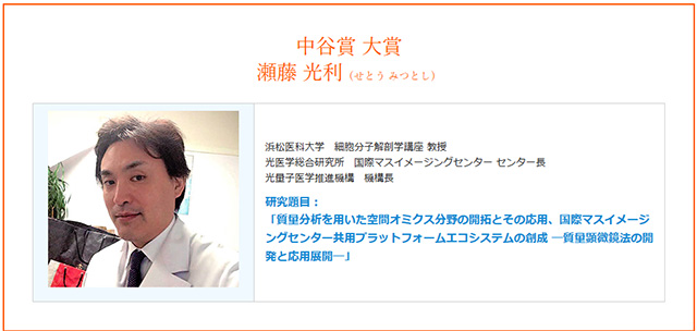そして2024年度 第17回目の中谷賞は、浜松医科大学 細胞分子解剖学講座 教授で、光医学総合研究所国際 マスイメージングセンター センター長、光量子医学推進機構 機構長 瀬藤光利 教授が大賞(賞金1000万円)を受賞。