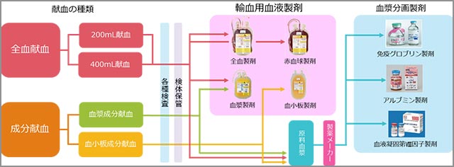 血漿分画製剤の製造には、全血献血・成分献血それぞれから生成される同製剤用原料血漿が必要となる。