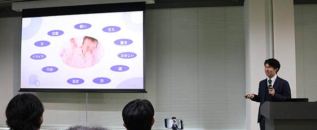事業概要:泣き声理解促進アプリ「あわベビ」の開発。「あわベビ」は、泣き声判別アプリとしては最高レベルの11種類まで泣き声の分類が可能で、赤ちゃんの感情や体調を泡で表現し、ユーザに伝える。
