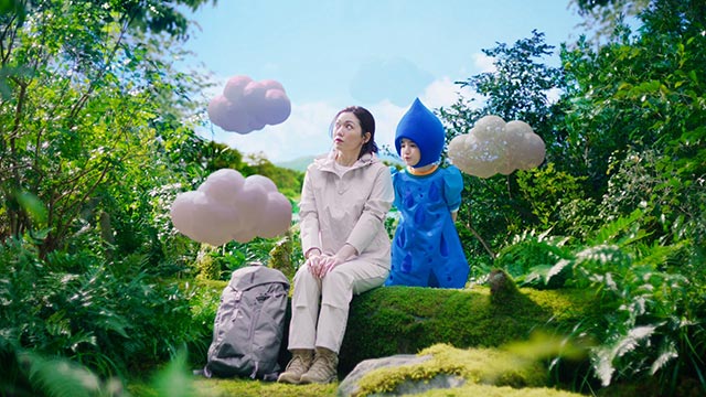 座りながら、どうやら疲れ気味でため息をつく 二階堂ふみ の前に、「いろいろ溜め込んでる?」と現れる おいしい水の精。