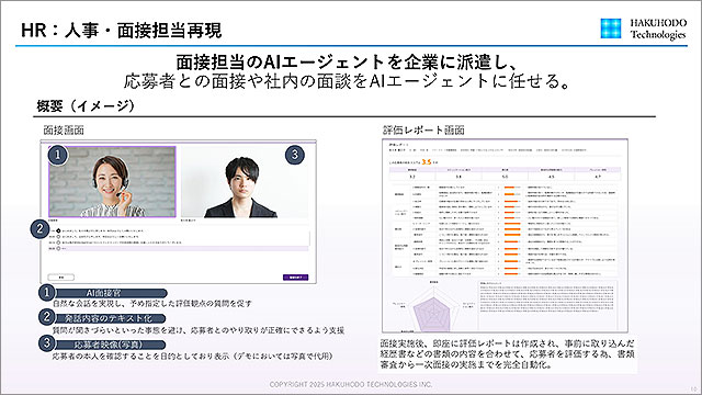 HR業界「人事・面接担当再現」では、面接担当のAIエージェントを企業に派遣し、応募者との面接や社内の面談をAIエージェントに任せると、面接実施後、即座に評価レポートが作成され、事前に取り込んだ経歴書などの書類の内容を合わせて、応募者を評価し、書類審査から一次面接の実施までを完全自動化できた。