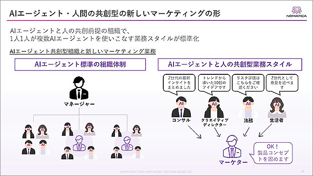 博報堂テクノロジーズのマルチAIエージェント業務支援ツール「Nomatica」(ノーマティカ)を導入することで、AIエージェント・人間の共創型の新しいマーケティングのかたちが実現し、AIエージェントと人の共創前提の組織で、1人1人が複数AIエージェントを使いこなす業務スタイルが標準化するという。