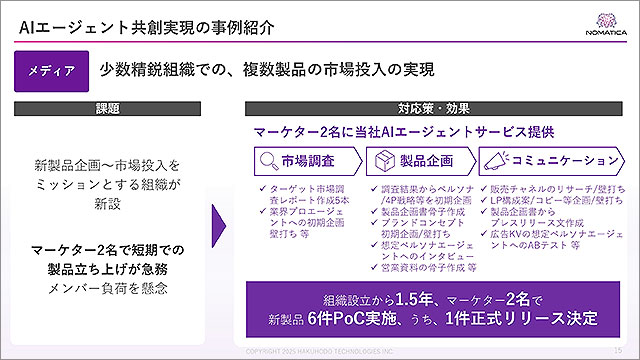 たとえば、マーケター2名で短期で製品立ち上げを求められている現場で、AIエージェントを導入したことで、ターゲット市場調査レポート作成5本、業界プロエージェントへの初期企画壁打ち、調査結果からペルソナ・4P戦略等を初期企画、製品企画書骨子作成、ブランドコンセプト初期企画・壁打ち、想定ペルソナエージェントへのインタビュー、営業資料の骨子作成、販売チャネルのリサーチ・壁打ち、LP構成案/コピー等企画・壁打ち、製品企画書からプレスリリース文作成、広告KVの想定ペルソナエージェントへのABテストなどを経て、組織設立から1.5年で、マーケターがたった2名で、新製品 6件PoC実施、うち1件が正式リリースできたという。