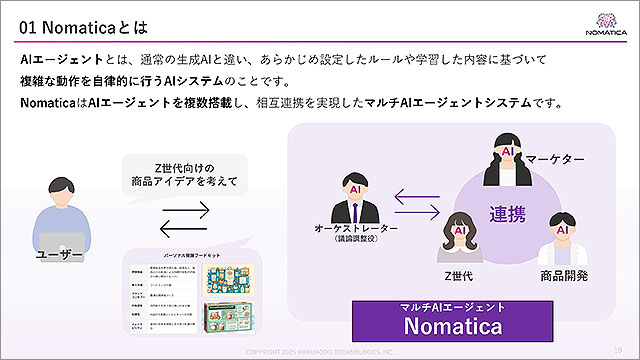 博報堂テクノロジーズ マルチAIエージェント業務支援ツール「Nomatica」(ノーマティカ)は、自律的×専門的なマルチAIエージェントを活用した業務支援ツール。