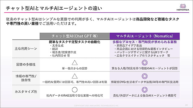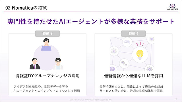 そこであらためて、博報堂テクノロジーズのマルチAIエージェント業務支援ツール「Nomatica」(ノーマティカ)の特長をチェックしていこう。