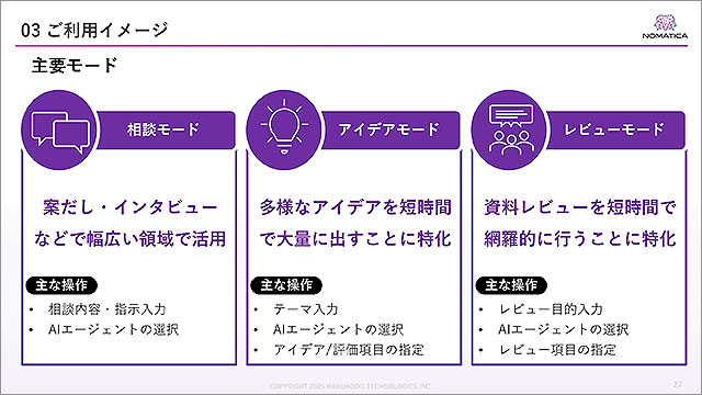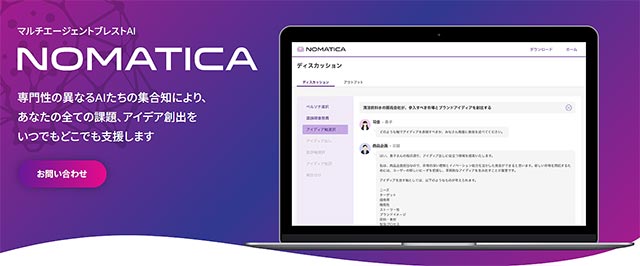 多様なアイデア創出、物理的な制約(時間や距離)解消、企画推進のサイクル、企画・提案書などの品質などを飛躍的にアップデートさせる博報堂テクノロジーズ マルチAIエージェント業務支援ツール「Nomatica」(ノーマティカ)。