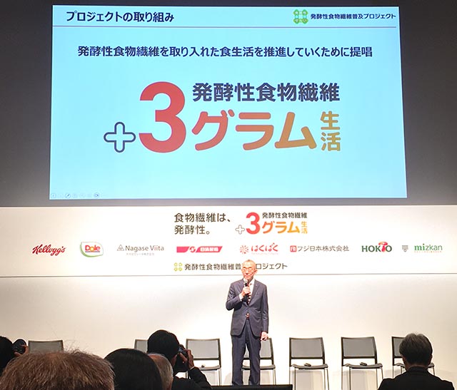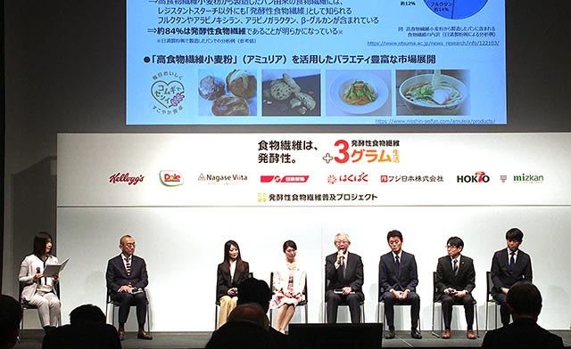 東京・渋谷で4月に開かれた発酵性食物繊維普及プロジェクトセミナーでは、日本ケロッグ、Dole、日清製粉、フジ日本、ホクト、mizkan の担当者などが登壇し、発酵性食物繊維をおいしく気軽に摂るポイントを教えてくれた。